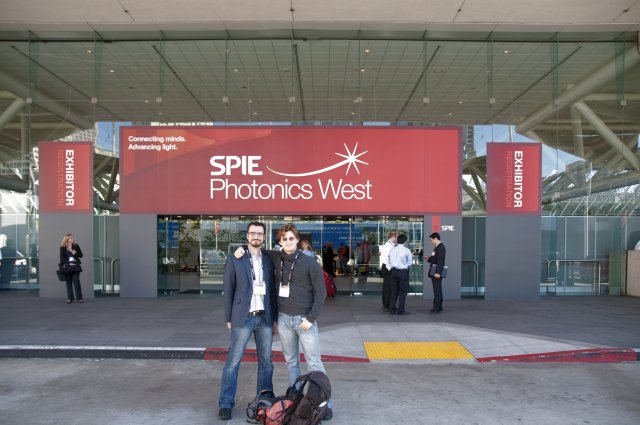 Taken at the Photonics West 2011, January 22-27. Dominic Lepage and Etienne Shaffer: old friends from Sherbrooke and Lausanne meeting in front of the Moscone Center, San Francisco.